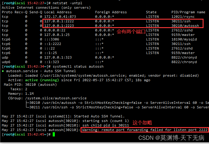 Restart=always # 定义了 autossh 退出后,Systemd 的重启方式RestartSec=42s # 设置在重启服务(Restart=)前暂停多长时间,跟sshd服务一样