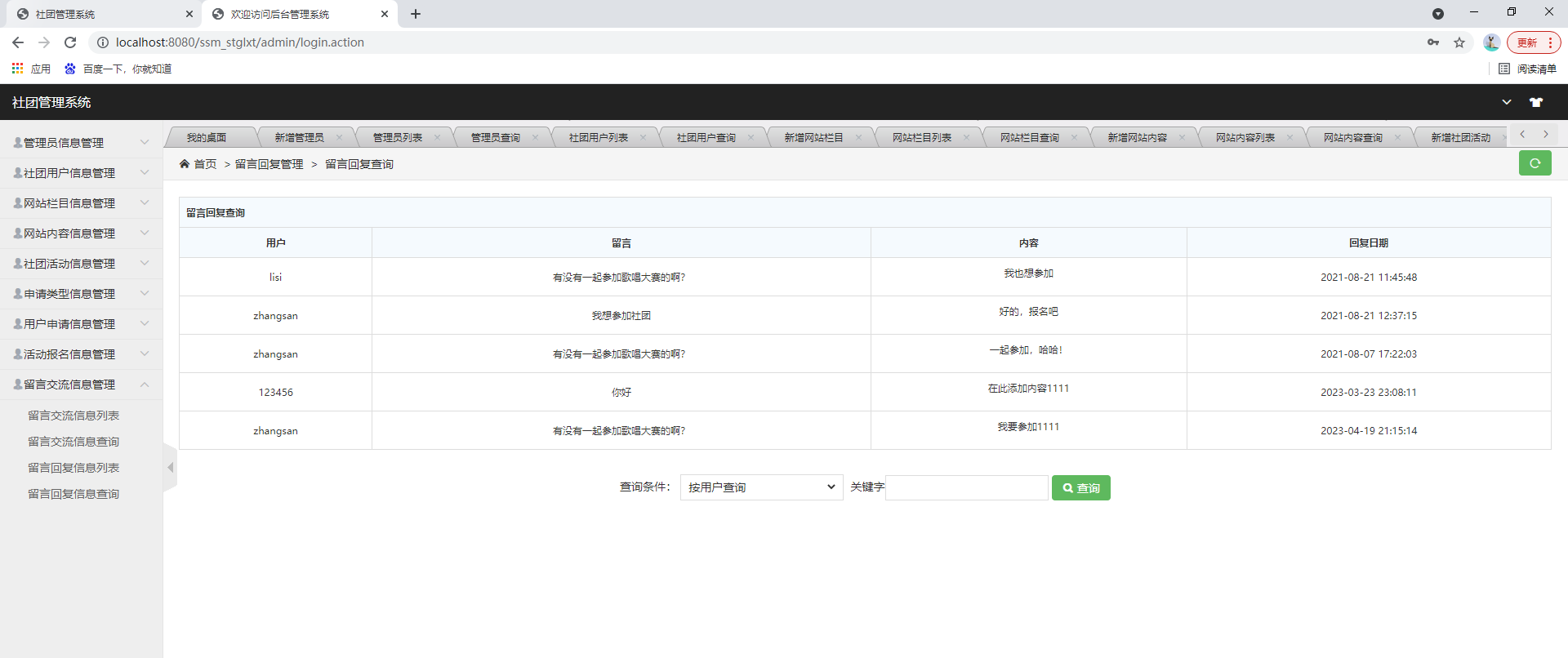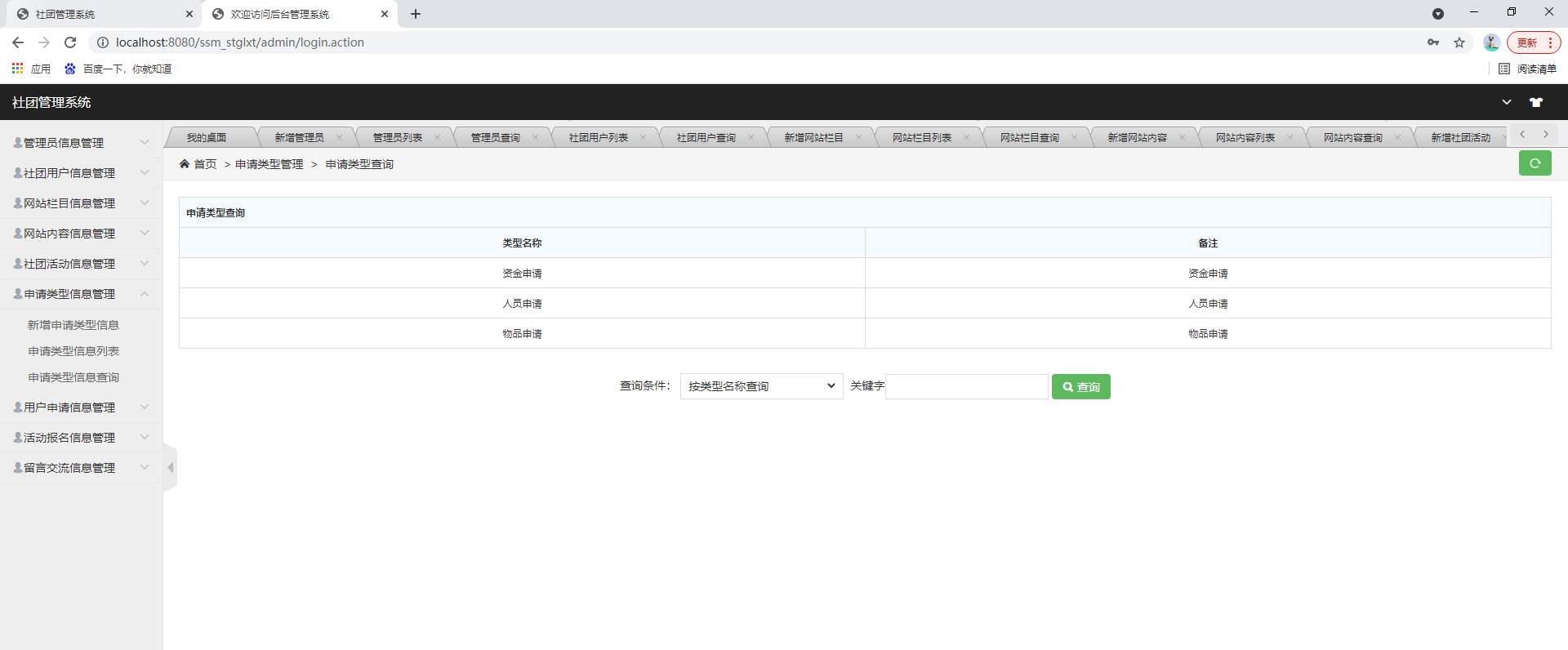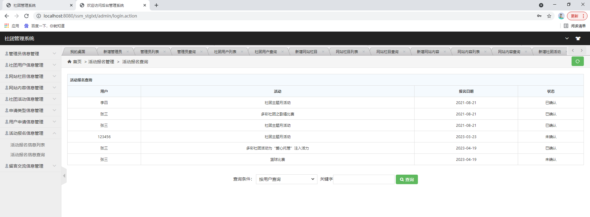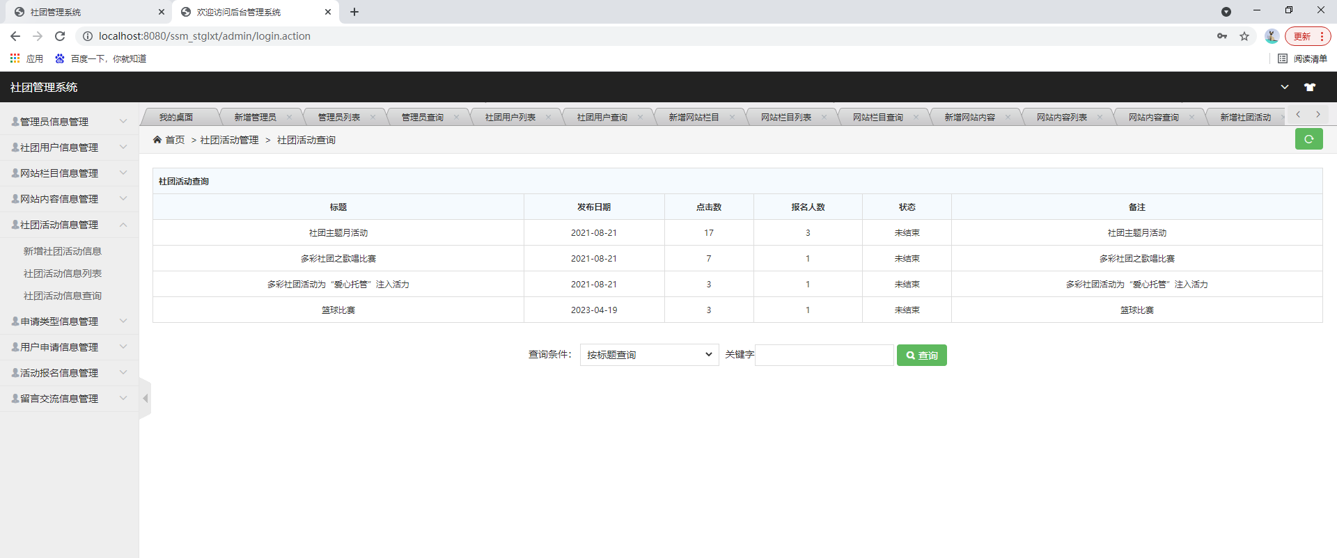 后台系统登陆、社团用户管理、管理员管理、网站公告管理、社团活动管理、申请类型管理、用户申请管理、活动报名管理、留言交流管理等功能。