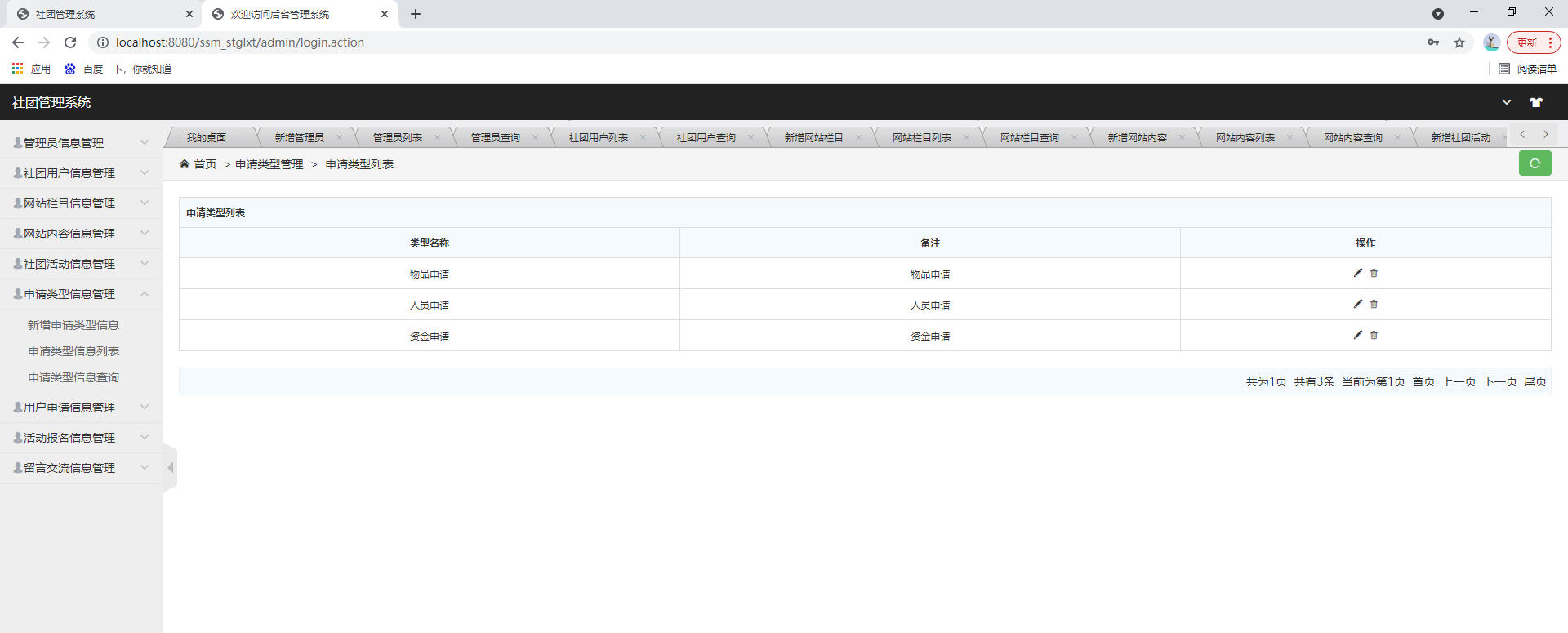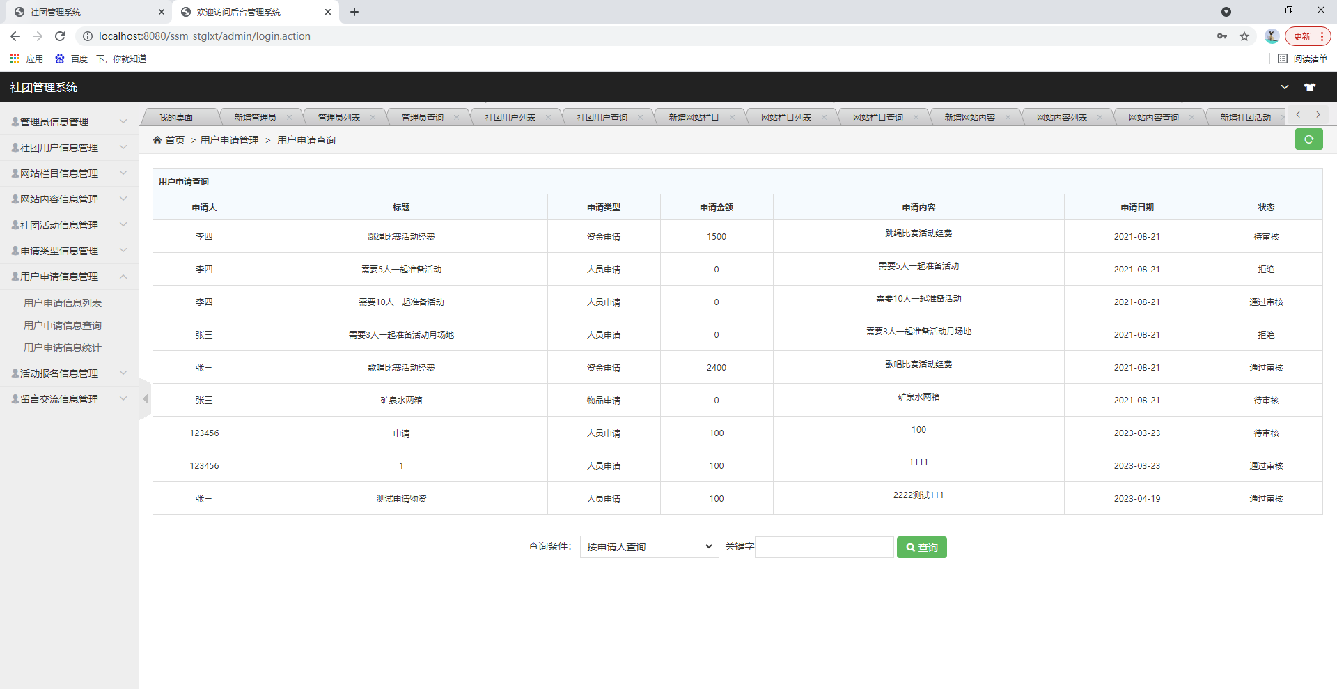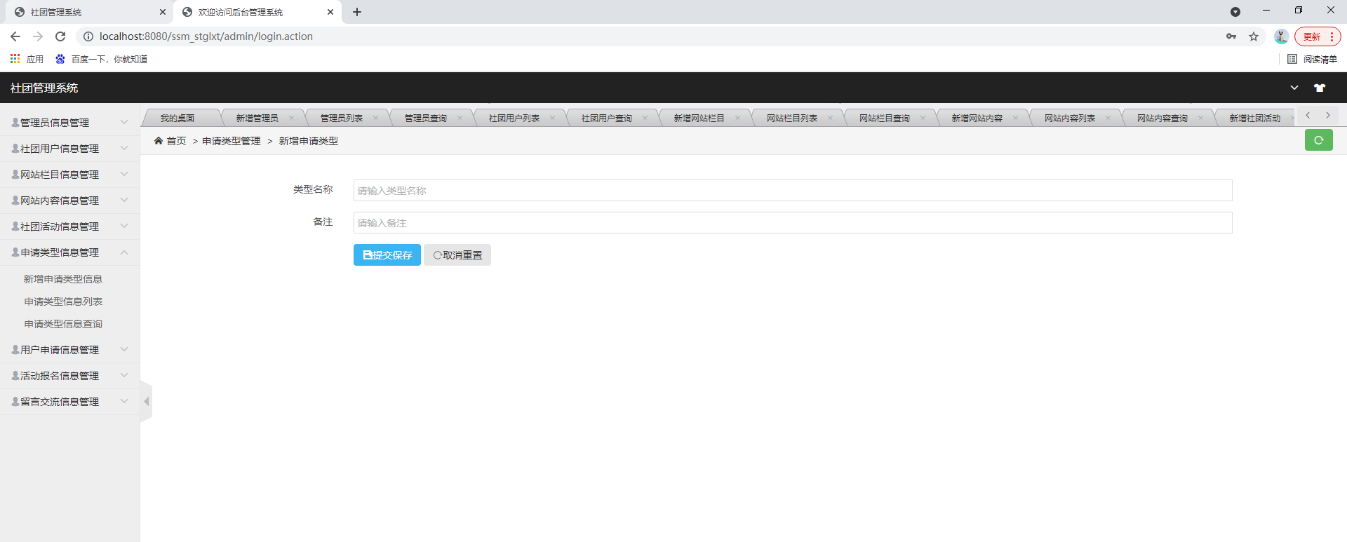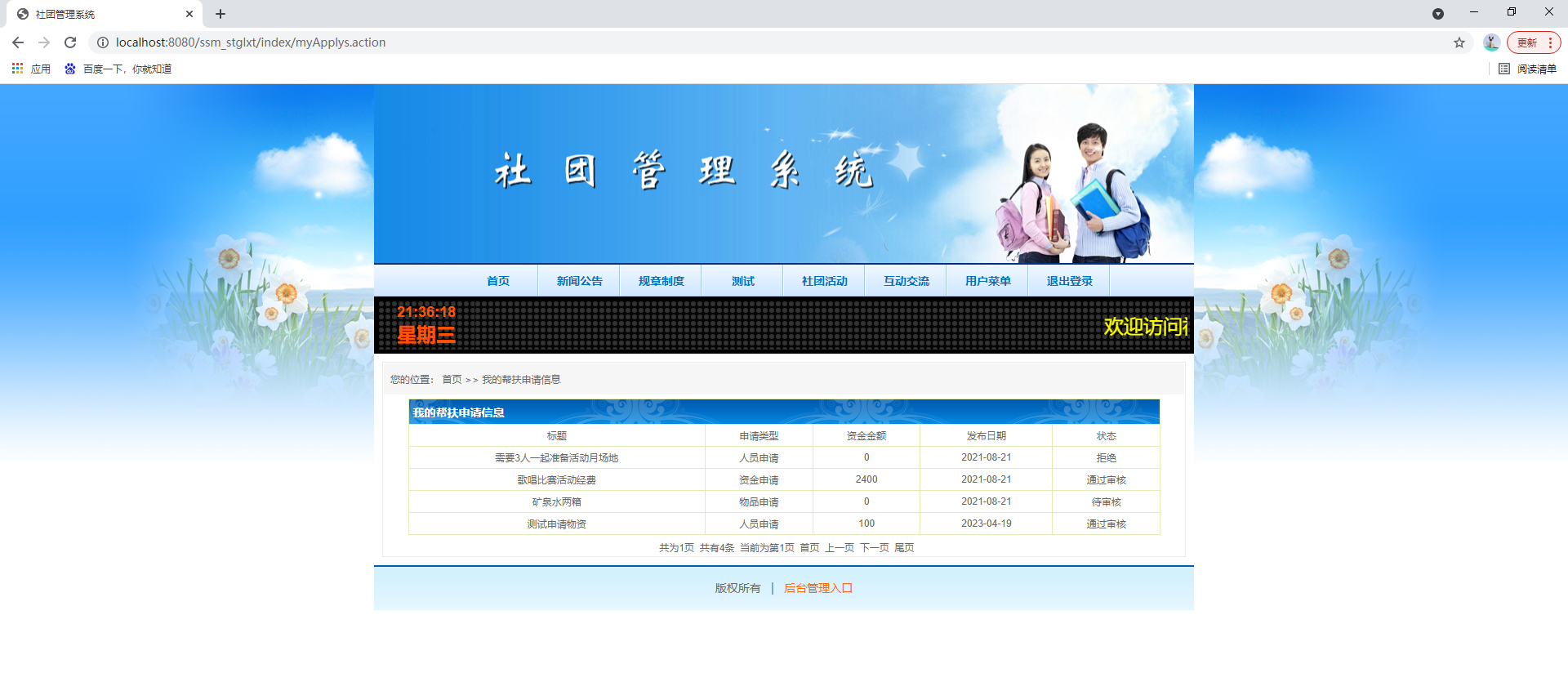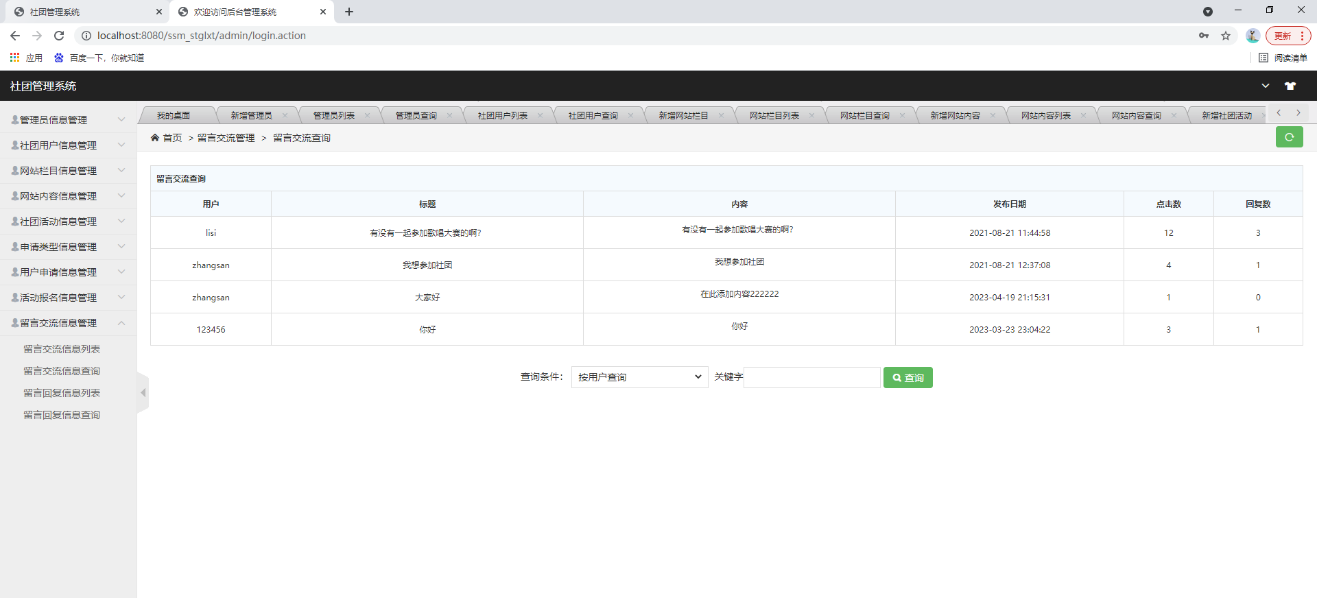 后台系统登陆、社团用户管理、管理员管理、网站公告管理、社团活动管理、申请类型管理、用户申请管理、活动报名管理、留言交流管理等功能。