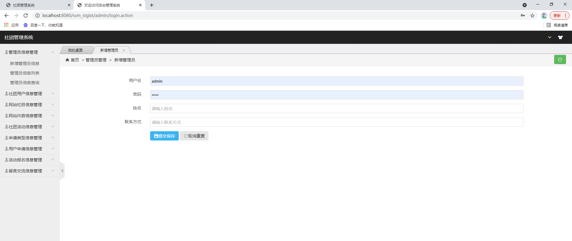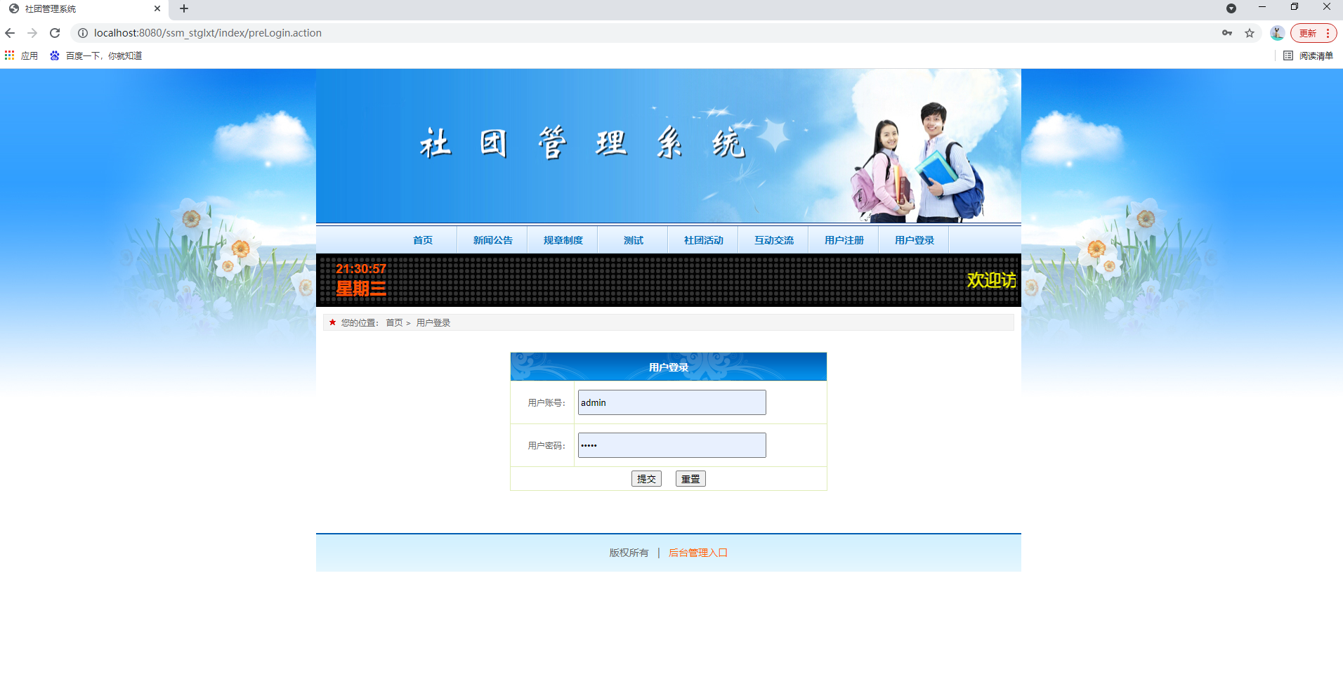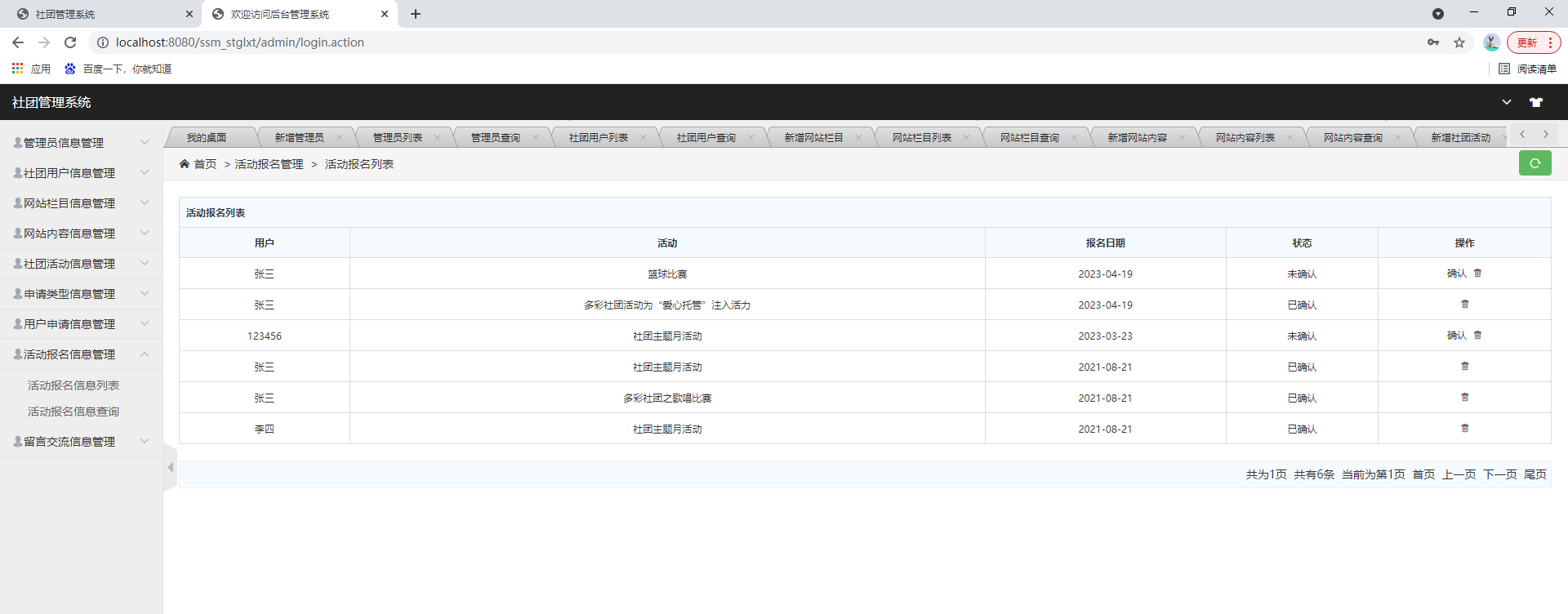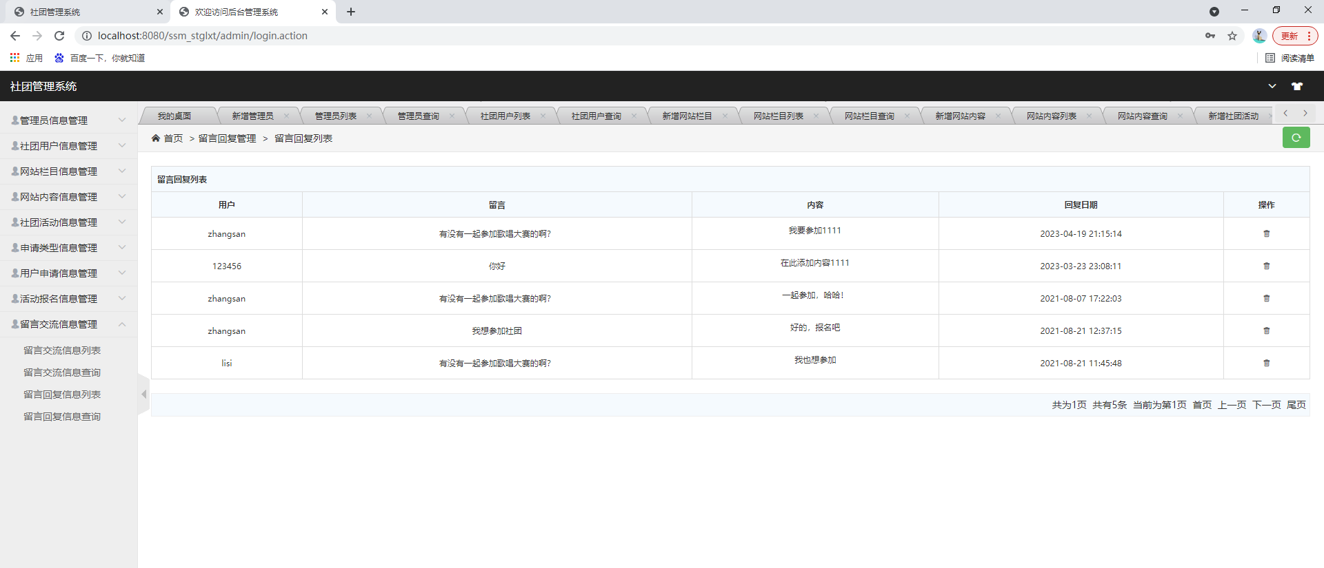 后台系统登陆、社团用户管理、管理员管理、网站公告管理、社团活动管理、申请类型管理、用户申请管理、活动报名管理、留言交流管理等功能。