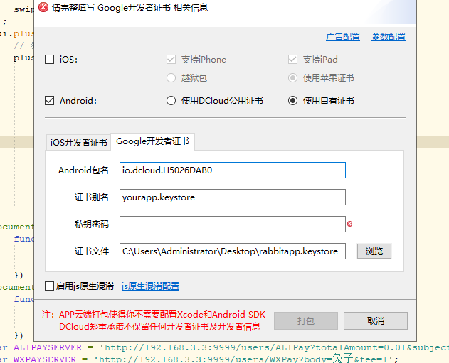 HBuilder打包的时候使用自有证书,同时保证签名与微信开放平台一致.