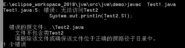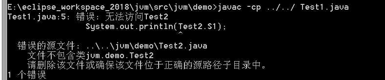 实验解释:编译Test1.java---在本目录查找Test2.java---找到,类路径为jvm.demo.Test2---由于是和Test1同包都在根路径那么类路径本应该是Test2--编译失败