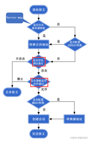 Server-map表记录了应用层数据中的关键信息,报文命中该表后,不再受安全策略的控制;会话表是通信双方连接状态的具体体现;Server-map表不是当前的连接信息,而是防火墙对当前连接分析后得到的即将到来报文的预测;防火墙收到报文先检查是否命中会话表;如果没有命中则检查是否命中Server-map表;命中Server-map表的报文不受安全策略控制;防火墙最后为命中Server-map表的数据创建会话表。