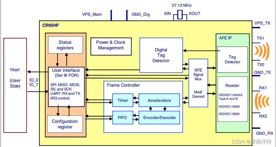 ST公司的CR95HF具有SPI和UART串行连接的多协议无接触13.6MHz收发器IC,可作为13.56MHz空中接口的模拟前端(AFE),支持ISO / IEC 14443 A和B,ISO / IEC 15693 (单或双用户)以及ISO / IEC 18092等协议,能管理阅读器模式的帧编码和转换,主要用在NFC中,接近标准应用。