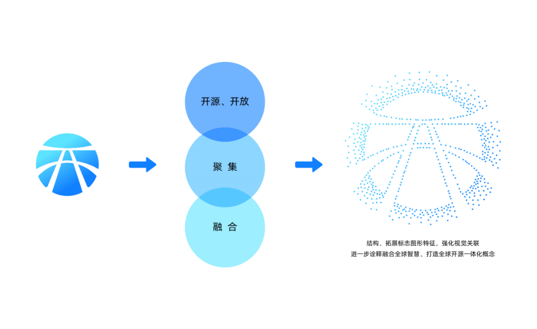 升级后的LOGO为共拓开源而生,“开”这一超级符号极具辨识度,可跟开源开发者日常生活场景完美融合,希望有更多开发者积极拥抱开源。同时,在原有LOGO基础上做了解构、拓展和演变,星星点点的蓝色粒子代表了聚集和融合,进一步诠释了融合全球智慧、打造全球开源一体化概念。