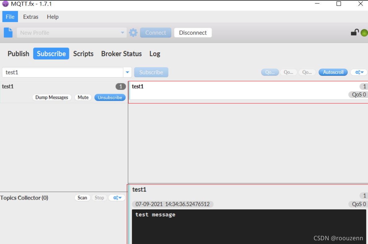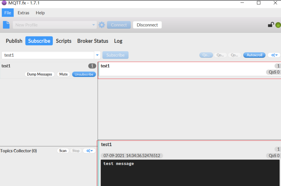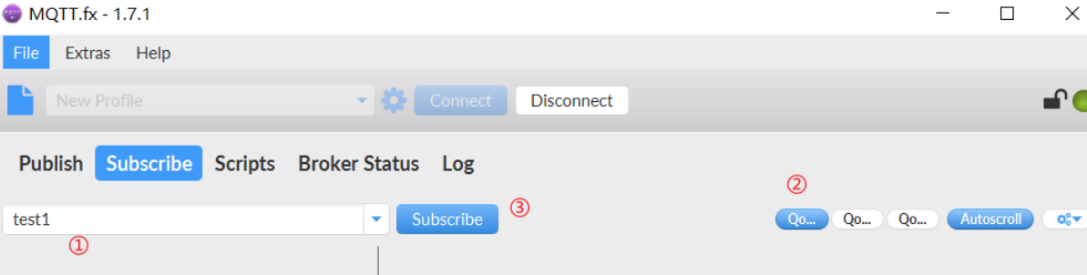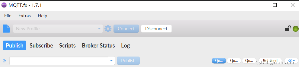 7.上述操作我们成功开启了一个订阅端,接下来我们再双击mqttfx启动一个发布端,重复上述操作,只不过这次我们连接成功后选择publish(发布)