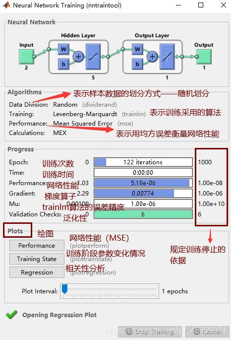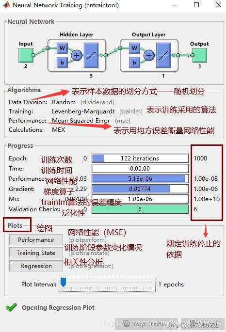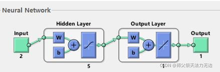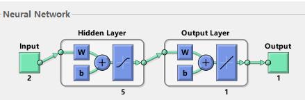 下图是训练神经网络时经常出现的一个界面,从这部分我们可以看到,这是一个2输入1输出,5个隐含层的BP网络,称为2-5-1网络结构