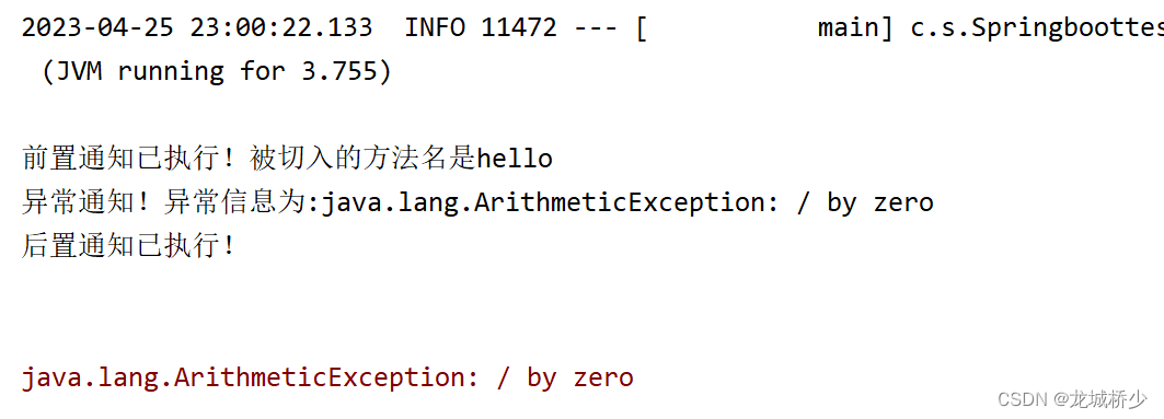 当我们的切入的方法产生异常时,会执行切入的异常通知并通过 throwing属性获取异常信息并输出,由于发生异常,方法没有执行return 语句,所以返回通知不会执行。请看效果: