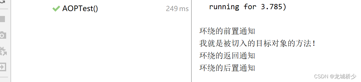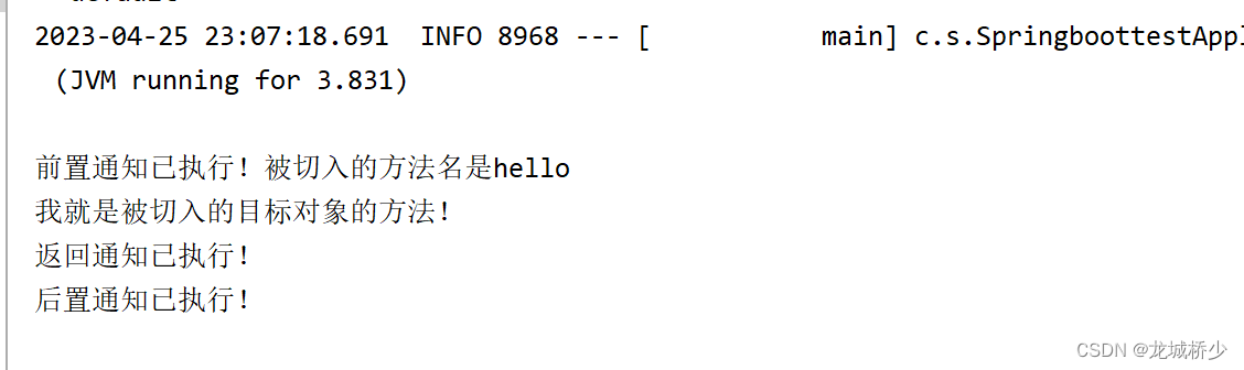 public class AnnotationAOP {@Pointcut("execution(* com.songqiao.controller.UserController.hello())")public void PointCut(){}//通过JoinPoint接口可以获取到方法名@Before("PointCut()")public void beforeAOP(JoinPoint joinPoint){String methodName = joinPoint.getSignature().getName();System.out.println("前置通知已执行!被切入的方法名是"+methodName);}@After("PointCut()")public void afterAOP(){System.out.println("后置通知已执行!");}@AfterReturning("PointCut()")public void afterReturningAOP(){System.out.println("返回通知已执行!");}//通过throwing属性可以获取到异常信息@AfterThrowing(value = "PointCut()",throwing = "ex")public void afterThrowingAOP(Throwable ex){System.out.println("异常通知!异常信息为:"+ex);}