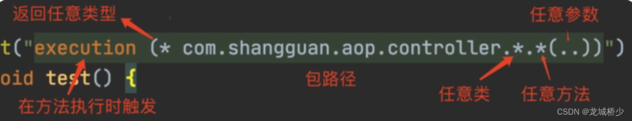 execution表示在方法执行的时候触发。以“*”开头,表明方法返回值类型为任意类型。然后是全限定的类名和方法名,“*” 可以表示任意类和任意方法。对于方法参数列表,可以使用“..”表示参数为任意类型。如果需要多个表达式,可以使用“&&”、“||”和“!”完成与、或、非的操作。