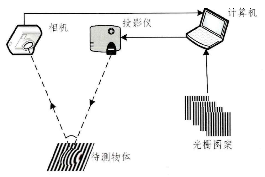 数字光栅投影(Digital Fringe Projector,DFP)三维测量系统主要由相机、投影设备(Projector)和计算机三部分组成,如图所示。首先在计算机端进行结构光图案编码,再由投影设备将编码图案投射到待测物体表面,因物体表面的高度变化将会对投射的条纹图像产生调制,然后由相机获取被调制的条纹图案传输到计算机进行条纹处理,计算出相位的分布,最后由相位和高度的映射关系求出待测物体的表面的高度。