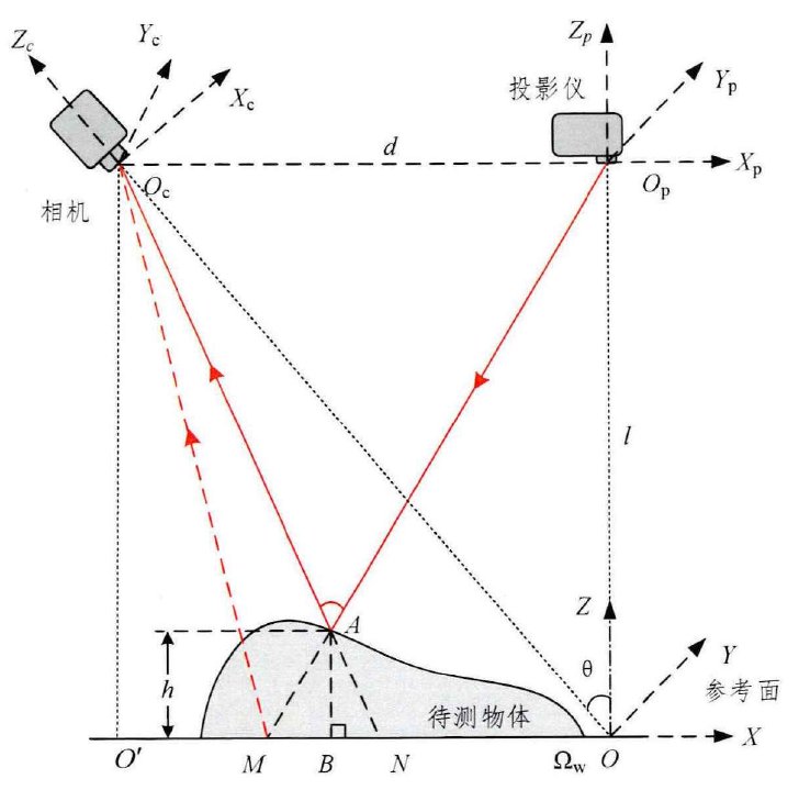 其工作流程如下,假设开始参考平面上没有物体,从投影仪端有一束入射光线OpA投射到点M,此时在相机视野中对应该光线的投射点为参考面的点M,当放置待测物体后,该光线投射到物体表面上的A点,若相机和投影的角度保持不变,此时从相机端获取图片,由于物体高度的变化,在相机视野中对应该光线的原投射点M平移到了点N,点N为反射光线的反向延长线与参考面的交点。由于从点M到点N的位移携带了点A相对于参考平面的高度信息h,即AB的长度,由几何关系我们可以根据位移MN求得高度h。而位移MN的长度又和投影光栅紧密相连,基于此,下面建立高度和相位的映射关系的数学模型。