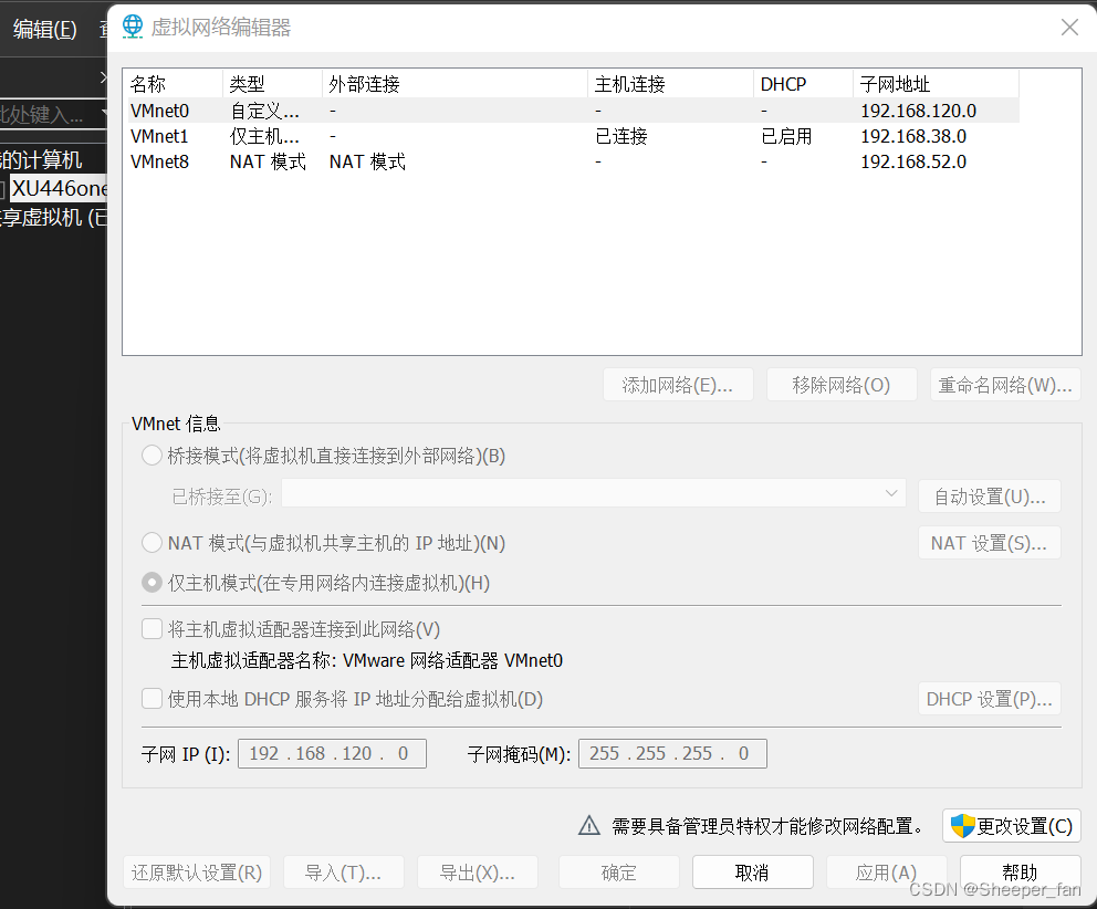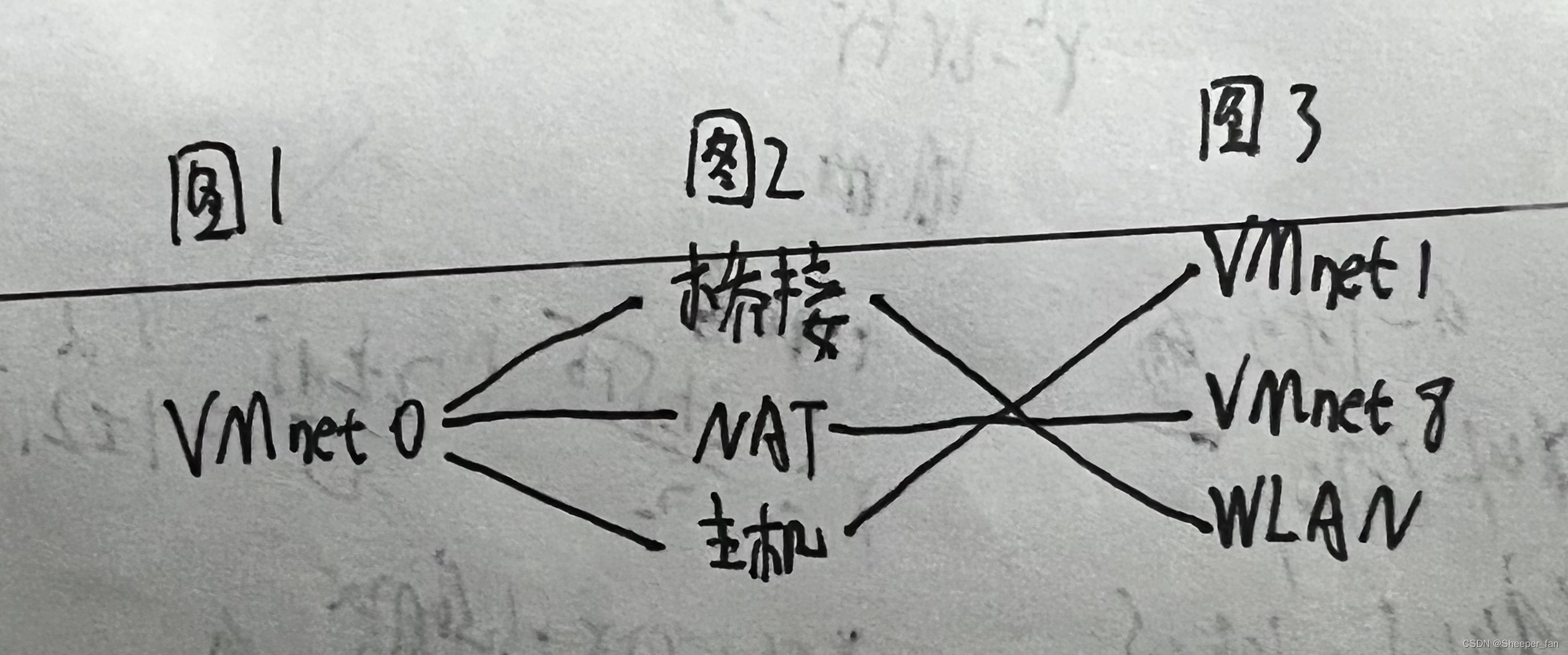 图2里有三种主要的模式,如果选择桥接,虚拟机利用的是本地网卡;如果选择NAT,虚拟机连接的是VMnet8;如果选择主机模式,虚拟机连接的是VMnet1,记住此处虚拟机就是图一的VMnet0,