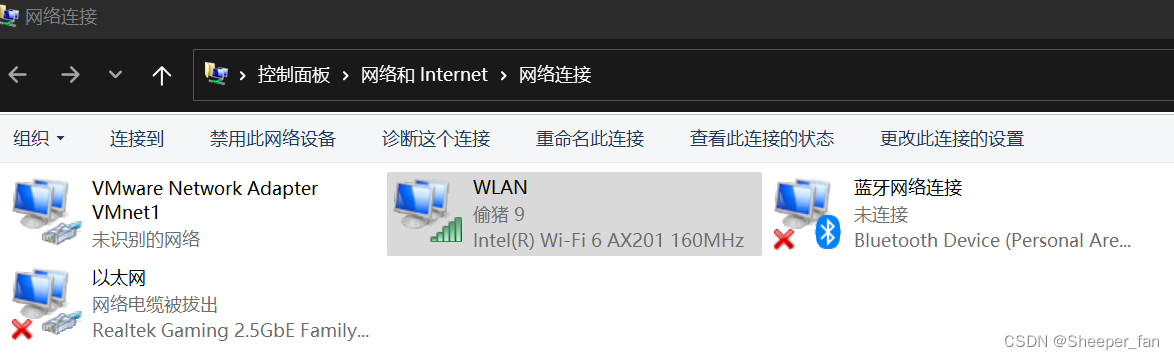 图1里虚拟的网络有两个:VMnet1、VMnet8,1和8本来应该都会在我电脑网络连接面板内显示,但是当我到自己的笔记本上去搜索网络连接查看网络个数时发现居然没有VMnet8,而我在连接图3的偷猪WLAN前连的校园网WLAN的状态里显示IPv6无法连接internet,这就很无语了。