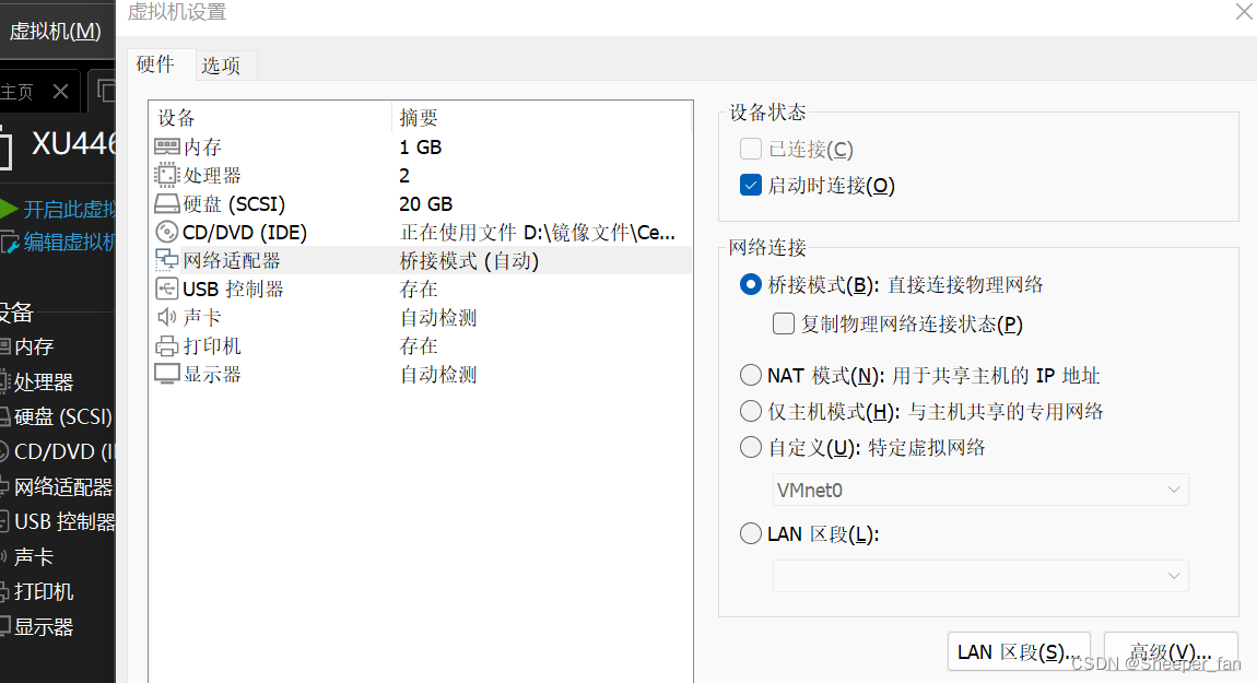 第三步:将虚拟机设置打开将网络适配器网络连接方式换为桥接模式