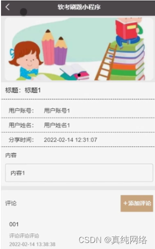 成绩分享,在成绩分享页面可以查看标题、图片、用户账号、用户姓名、分享时间、内容等信息,并根据需要进行评论操作;如图5-5所示。