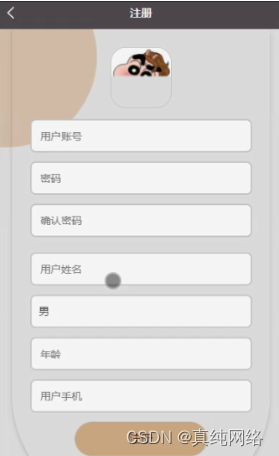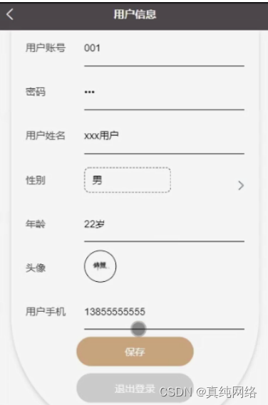 用户信息,在用户信息页面通过填写用户账号、密码、用户姓名、性别、年龄、头像、用户手机等详细信息进行保存或退出登录操作,如图5-7所示。