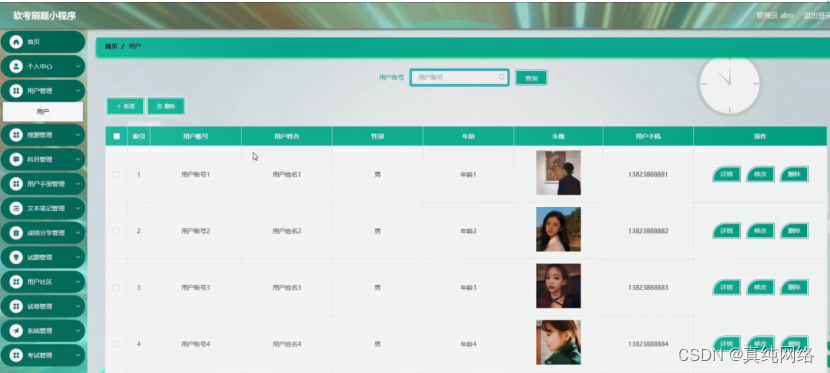 用户管理,在用户管理页面可以对索引、用户账号、用户姓名、性别、年龄、头像、用户手机等内容进行详情、修改或删除等操作,如图5-10所示。