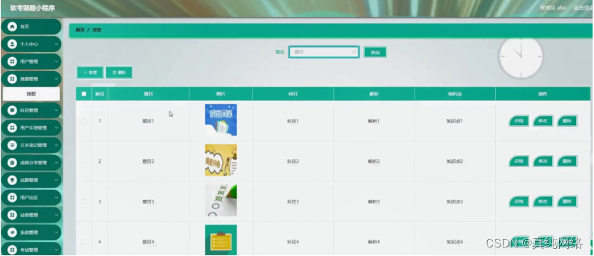 搜题管理,在搜题管理页面可以对索引、题目、图片、科目、解析、知识点等内容进行详情,修改或删除等操作,如图5-11所示。