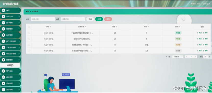 试题管理,在试题管理页面可以对试卷、试题名称、分值、答案、类型等内容进行修改或删除等操作,如图5-15所示。