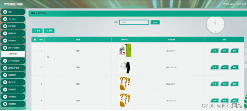用户手册管理,在用户手册管理页面可以对索引、问题、封面图片、发布时间等内容进行详情、修改或删除等操作,如图5-12所示。