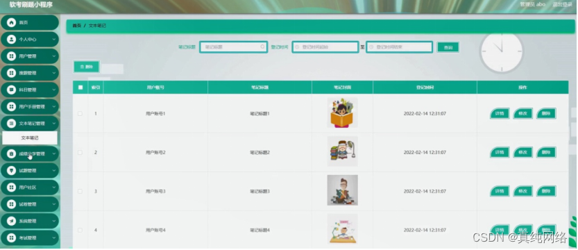 文本笔记管理,在文本笔记管理页面可以对索引、用户账号、笔记标题、笔记封面、登记时间等内容进行详情,修改和删除等操作,如图5-13所示。