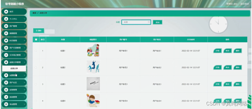 成绩分享管理,在成绩分享管理页面可以对索引、标题、成绩图片、用户账号、用户姓名、分享时间等内容进行详情,修改或删除等操作,如图5-14所示。