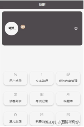 用户,在我的页面可以对用户手册、文本笔记、我的收藏管理、试卷列表、考试记录、错题本、意见反馈、我要发贴、我的发贴等详细信息进行操作,如图5-6所示。