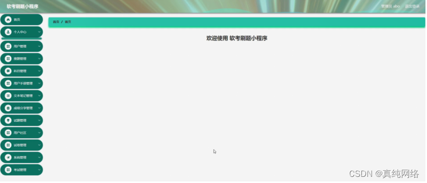 管理员登陆系统后,可以对首页、个人中心、用户管理、搜题管理、科目管理、用户手册管理、文本笔记管理、成绩分享管理、试题管理、用户社区、试卷管理、系统管理、考试管理等功能进行相应操作,如图5-9所示。