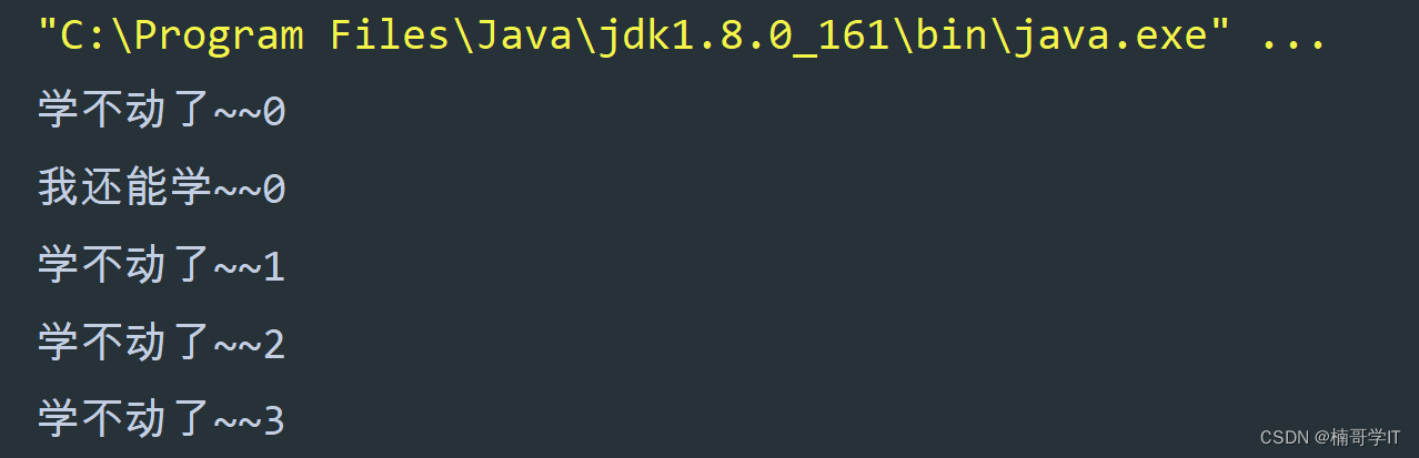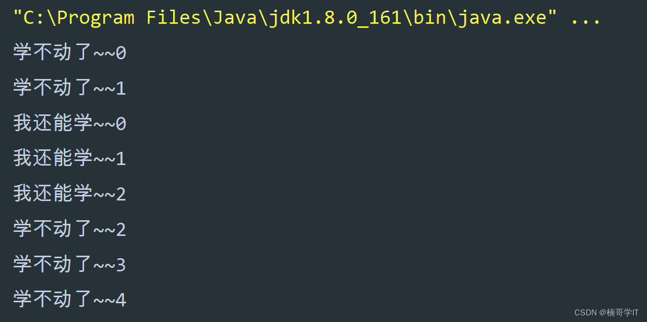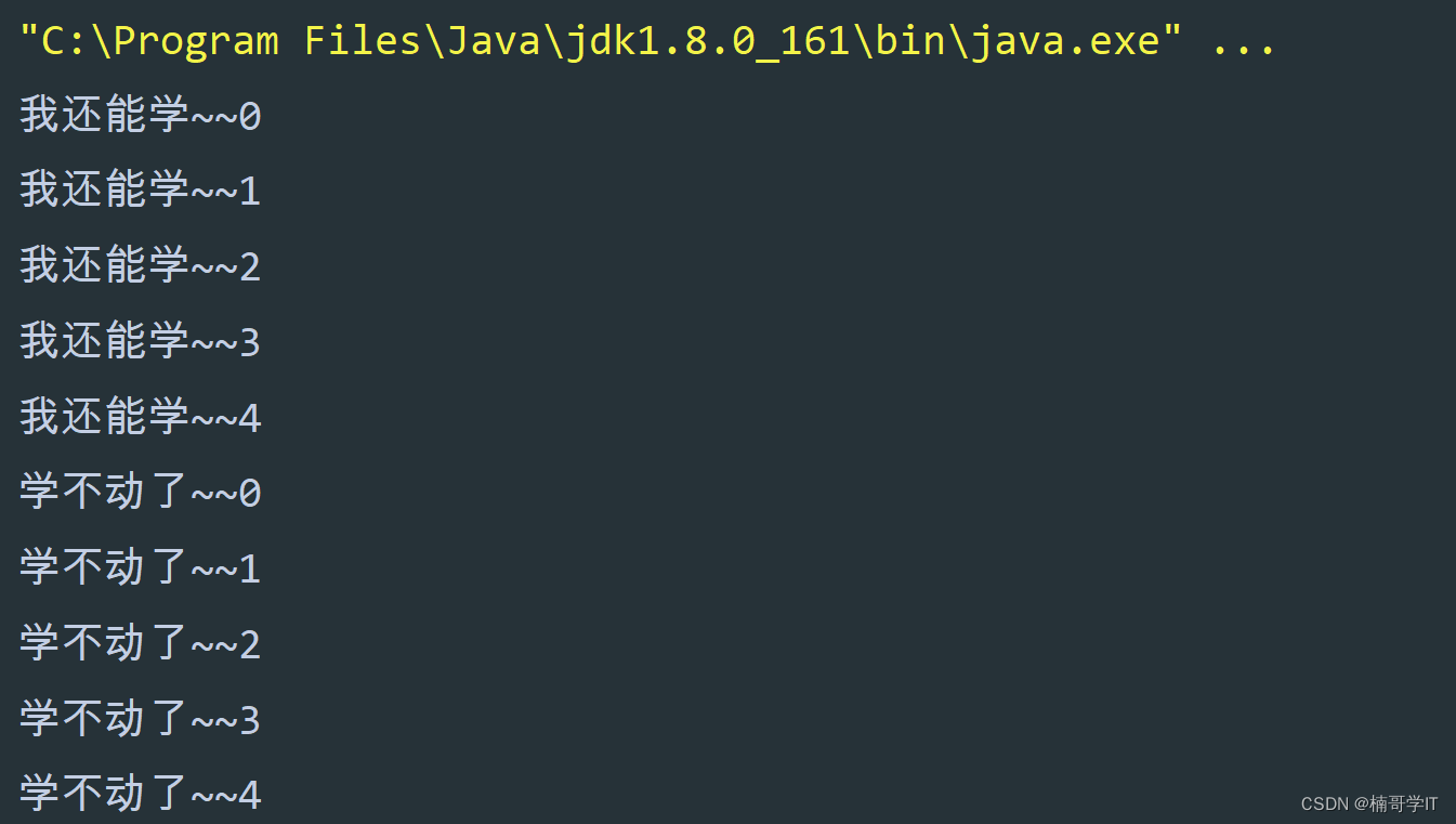 如果循环次数5不易看出,可以增加循环的次数。从结果可以看出,"学不动了~~"和"我还能学~~"的有交叉了,与方法调用的顺序没有关系了,其实是开启了新的线程。