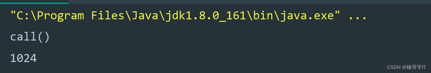 public class MyCallable implements Callable<String> {@Overridepublic String call() throws Exception {System.out.println("call()");return "1024";}public static void main(String[] args) throws ExecutionException, InterruptedException {MyCallable myCallable = new MyCallable();FutureTask<String> task = new FutureTask<String>(myCallable);new Thread(task, "A").start();new Thread(task, "B").start();String string = task.get(); //获取返回值System.out.println(string);}