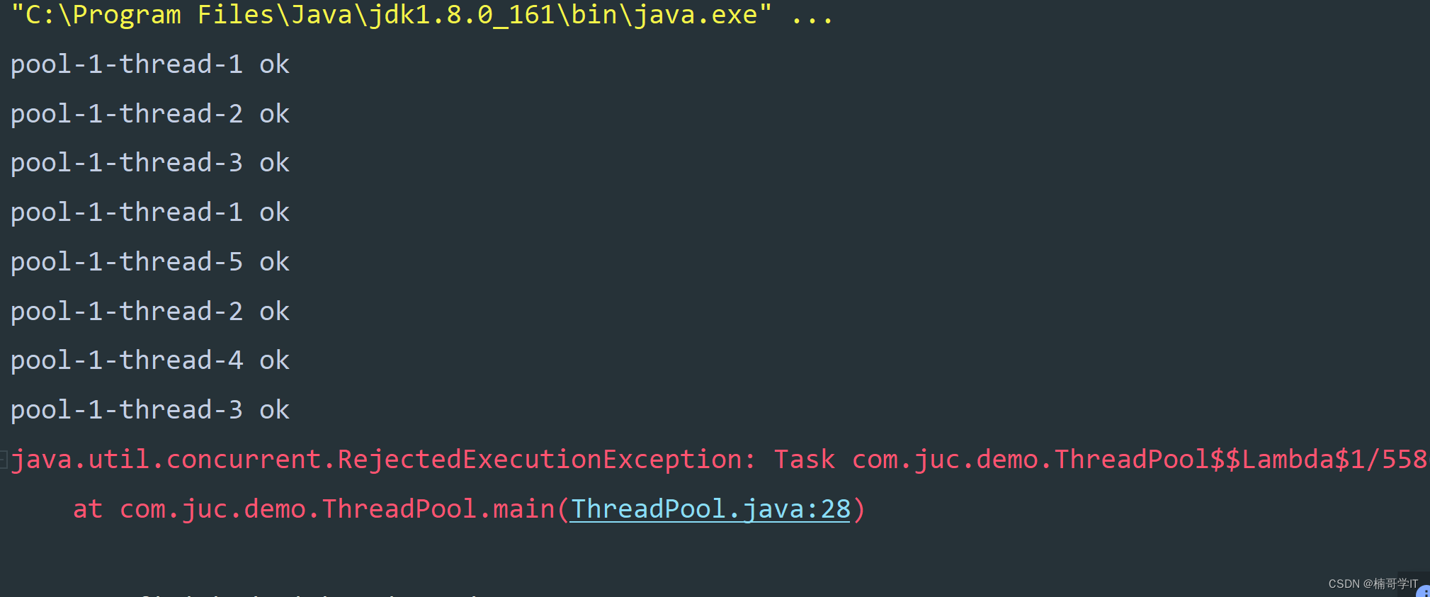 public class ThreadPool {public static void main(String[] args) {ThreadPoolExecutor threadPoolExecutor = new ThreadPoolExecutor(3,5,2,TimeUnit.SECONDS,new LinkedBlockingDeque<>(3),Executors.defaultThreadFactory(),new ThreadPoolExecutor.DiscardOldestPolicy() //队列满了,尝试去和最早的竞争,也不会抛出异常!);try {// 最大承载:Deque + max // 超过 RejectedExecutionExceptionfor (int i = 0; i < 9; i++) {// 使用了线程池之后,使用线程池来创建线程threadPoolExecutor.execute(() -> {System.out.println(Thread.currentThread().getName() + " ok");});}} catch (Exception e) {e.printStackTrace();} finally {// 线程池用完,程序结束,关闭线程池 \threadPoolExecutor.shutdown();}}