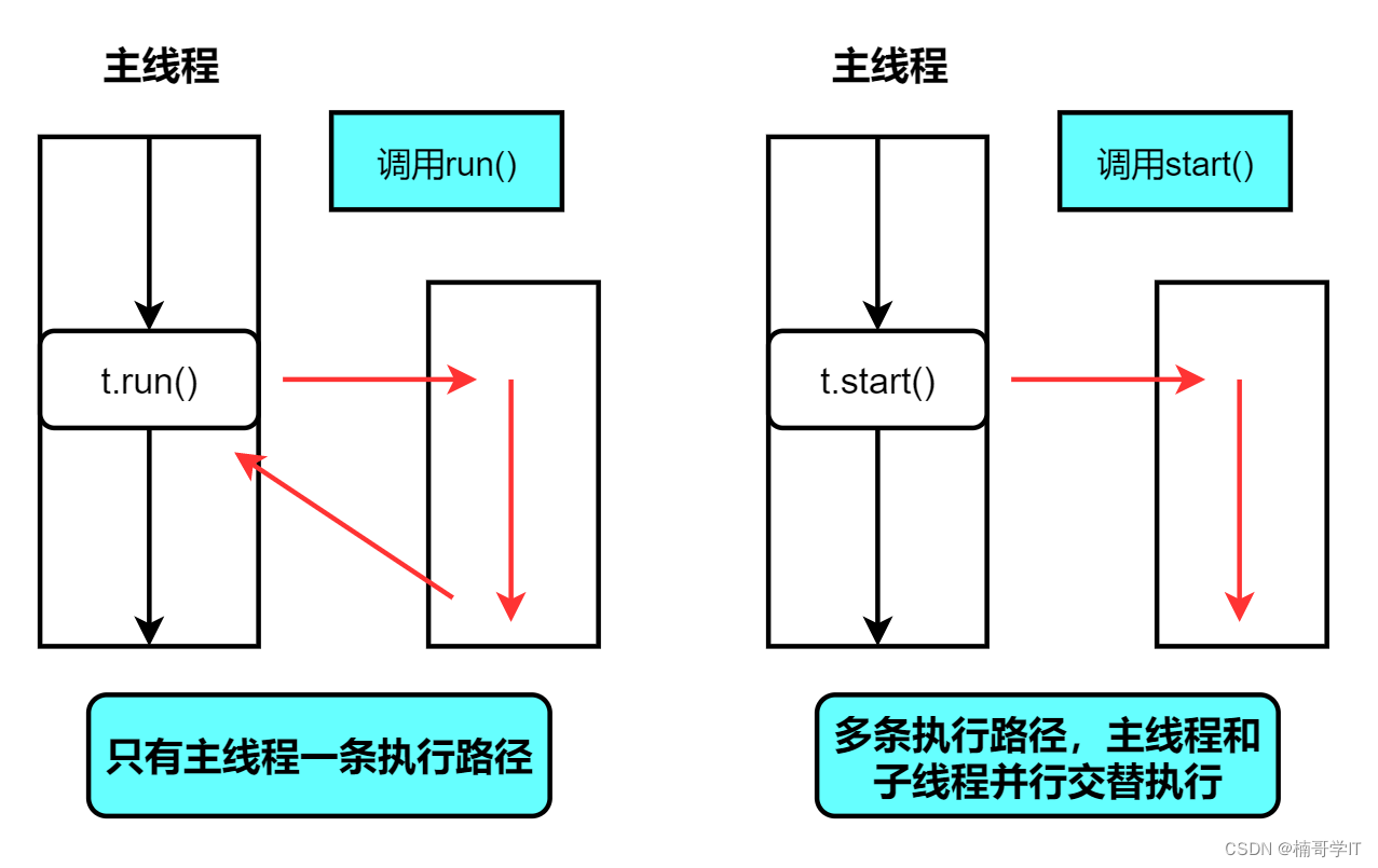 注意:一定要用start()方法来开启线程,而不是直接调用run()方法,直接调用run()方法是不能开启线程的。