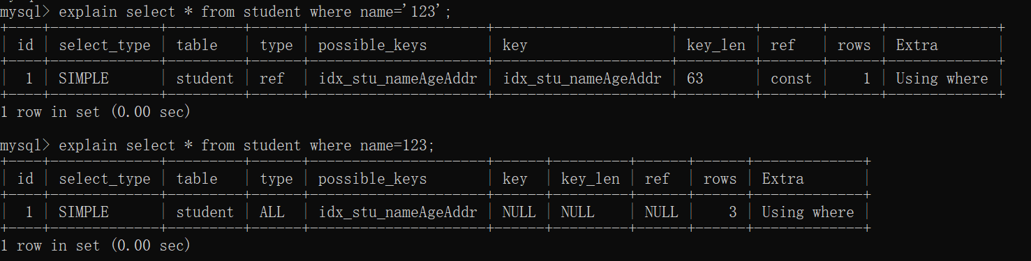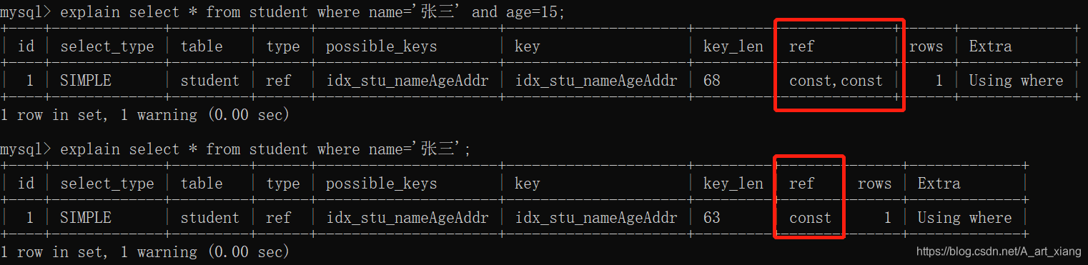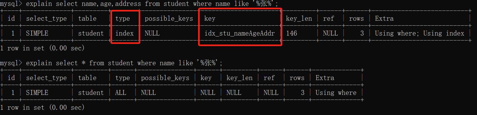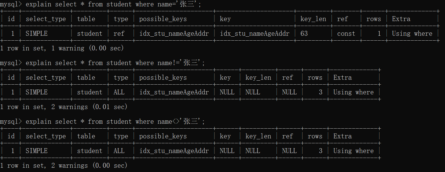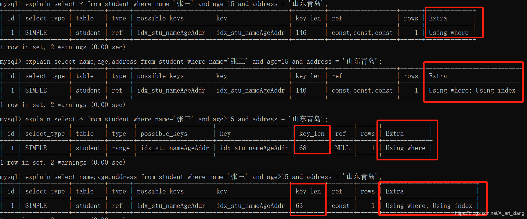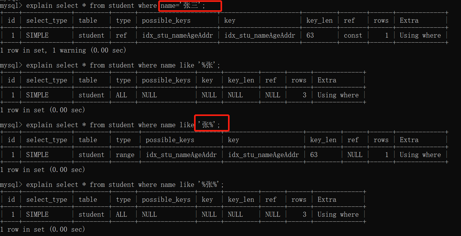 explain select * from student where name='张三' and age=15 and address = '山东青岛';