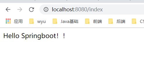public class HelloController {@RequestMapping("/index")public String index(){return "Hello Springboot!!";}