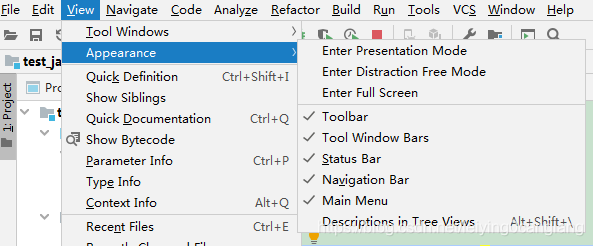 [图1.3]:若IDEA底部没有显示工具栏或状态栏,可在View里打开,显示出工具栏会方便我们使用。可以去尝试下这几个选项。