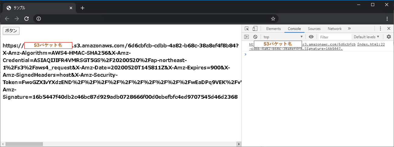 Webページのボタンをクリックすると、コンソールログとWeb画面に署名付きURLが表示される。