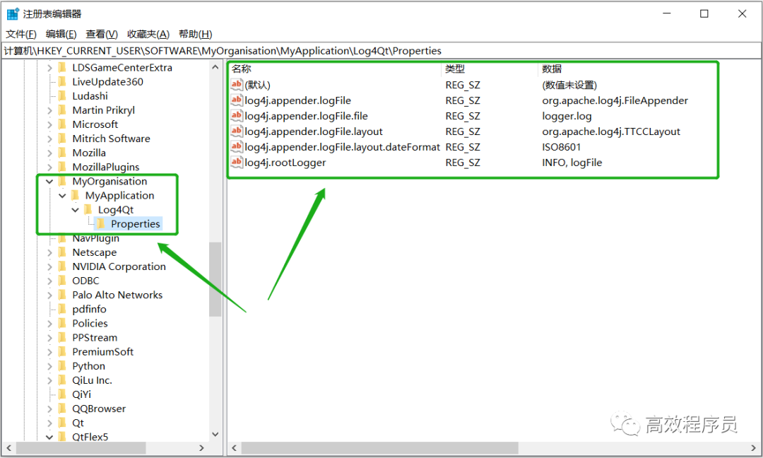 在 Windows 中,可以在注册表中添加相应的配置。例如,路径:计算机\HKEY_CURRENT_USER\SOFTWARE\MyOrganisation\MyApplication\Log4Qt\Properties: