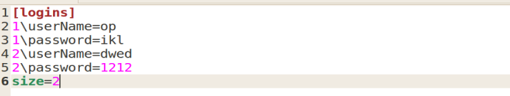 QSettings settings("confif.ini",QSettings::IniFormat);QList logins;int size = settings.beginReadArray("logins");for (int i = 0; i < size; ++i){settings.setArrayIndex(i);Login login;login.userName = settings.value("userName").toString();login.password = settings.value("password").toString();logins.append(login);}settings.endArray();for(int i=0;i