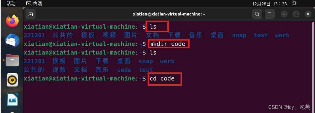 首先可以创建一个文件夹,用于存放你的代码,方便以后查找。ls 用于查看当前路径中的内容,mkdir+文件名是创建目录文件,cd是切换目录,就是切换到code中。