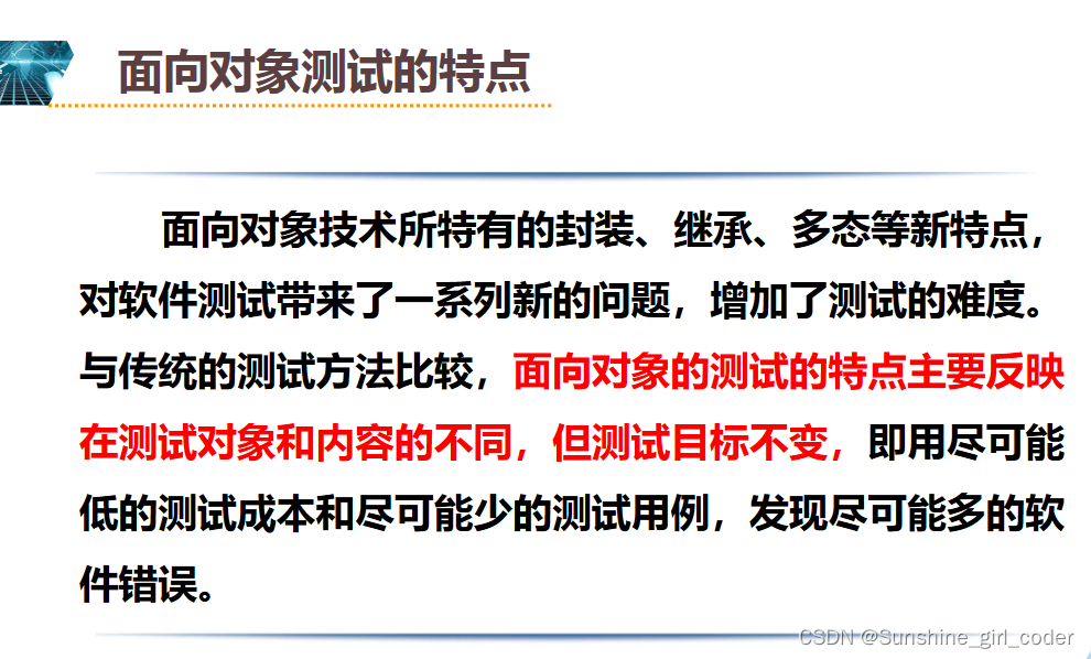 面向对象软件测试的目标与传统测试一样:用尽可能低的测试成本和尽可能少的测试用例,发现尽可能多的软件缺陷。