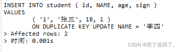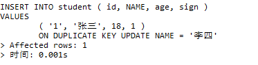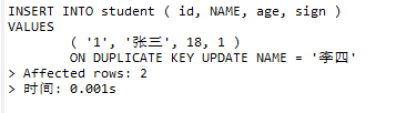 VALUES( '1', '张三', 18, 1 ) ON DUPLICATE KEY UPDATE NAME = '李四';