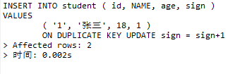 VALUES( '1', '张三', 18, 1 ) ON DUPLICATE KEY UPDATE sign = sign+1;