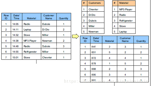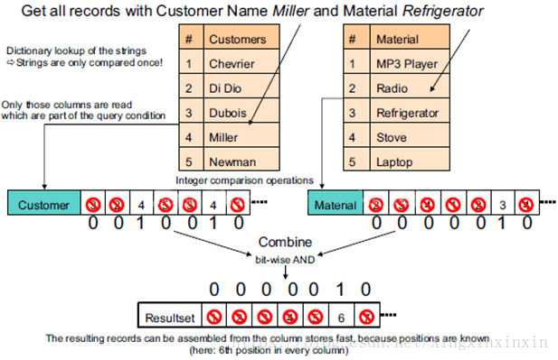 图列分析:首先将Customes Name列及Material列做逻辑化索引标识,查询时分别匹配Materia=Refrigerator及Customes Name=Miller的数据,然后做交叉匹配