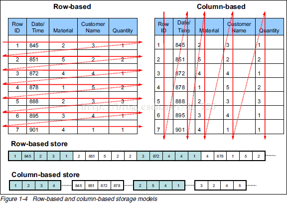 3) 两种存储的数据分布。由于列存储的每一列数据类型是同质的,不存在二义性问题。比如说某列数据类型为整型(int),那么它的数据集合一定是整型数据。这种情况使数据解析变得十分容易。相比之下,行存储则要复杂得多,因为在一行记录中保存了多种类型的数据,数据解析需要在多种数据类型之间频繁转换,这个操作很消耗CPU,增加了解析的时间。所以,列存储的解析过程更有利于分析大数据。