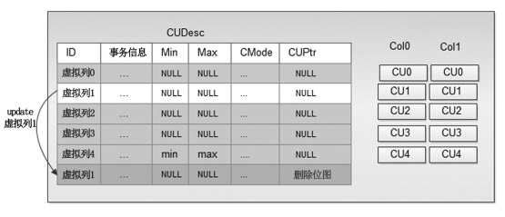 注:Cmn表示第 m 列的、CUid是n(第n个)的压缩单元。每个 CU 对应一个 CUDesc的记录,在 CUDesc里记录了整个 CU 的事务时间戳信息、CU 的大小、存储位置、magic校验码、min/max等信息。