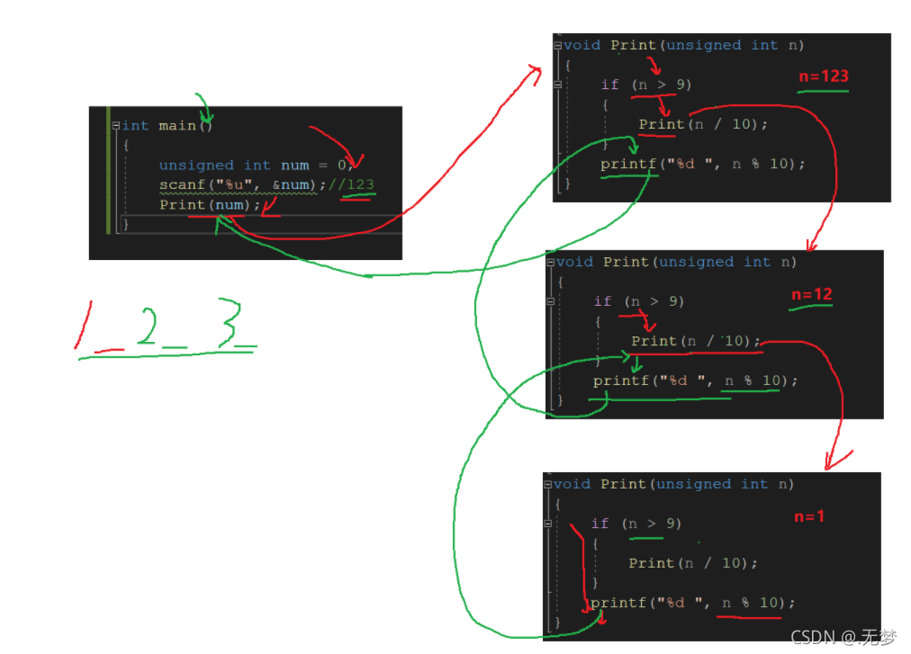 {if (n > 9){fun(n/10);}printf("%d ", n % 10);