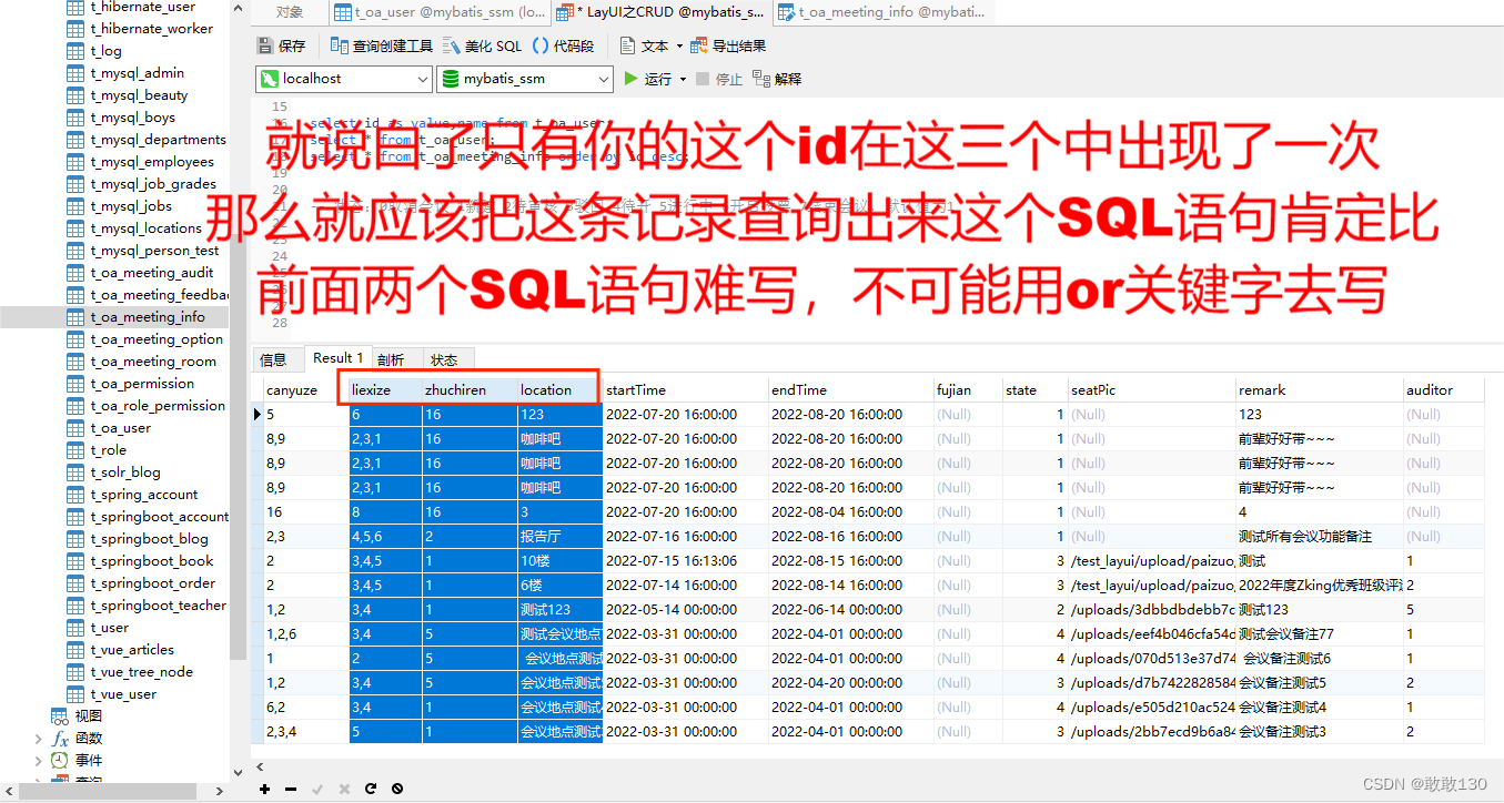 有一个问题审批人有空的,因为我们的会议状态开始的时候是还没有指定审批人,但我们的会议要查询出来,点我的会议,我没有指定审批人就查询不出来,这样就不合理,如果说这样的话,我们的每一个会议都无法送审了要么就是查不出来,查不出来就没办法送审,你只有送审了才能查出来,进那个嘶循环了吧,那么这个SQL语句改怎么写如下所示: