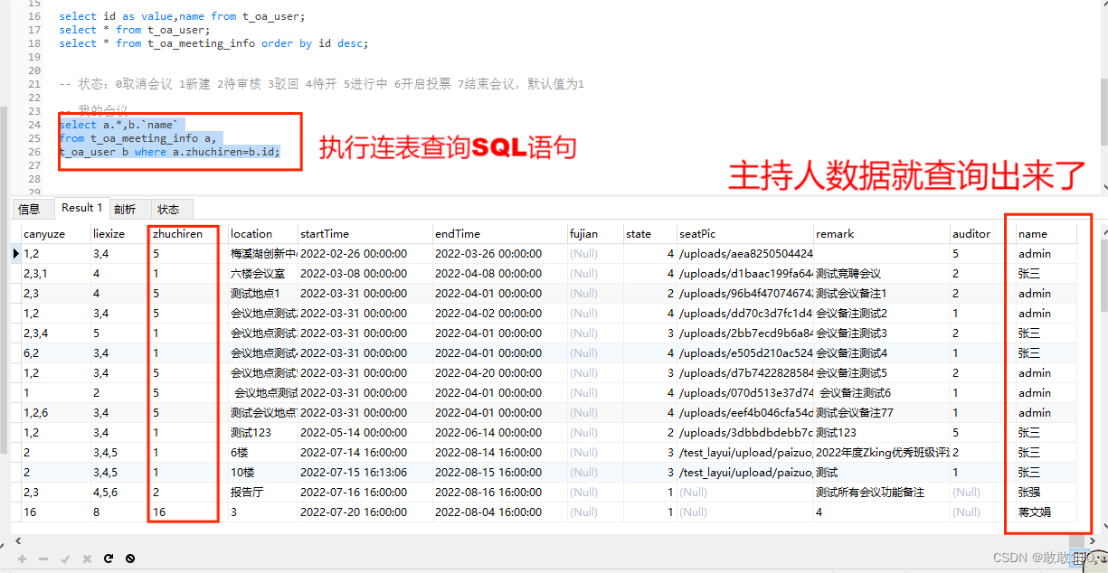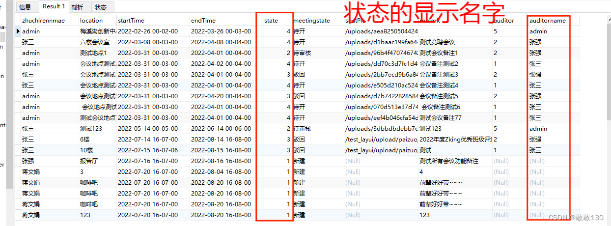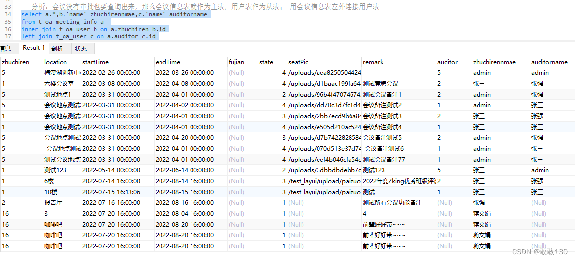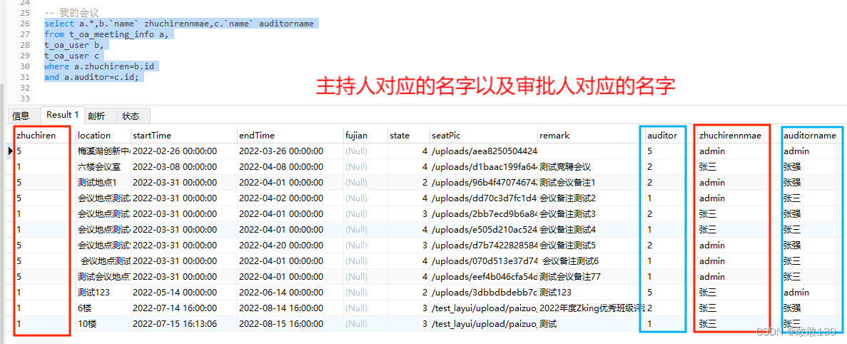 select a.id,a.title,a.content,a.canyuze,a.liexize,a.zhuchiren ,b.`name` zhuchirennmae, a.location, DATE_FORMAT(a.startTime,'%Y-%m-%d %H-%m-%s') startTime, DATE_FORMAT(a.endTime,'%Y-%m-%d %H-%m-%s') endTime, a.state, (case a.statewhen 0 then '取消会议'when 1 then '新建'when 2 then '待审核'when 3 then '驳回'when 4 then '待开'when 5 then '进行中'when 6 then '开始投票'when 7 then '结束会议'else '其他' end ) meetingstate, a.seatPic,a.remark,a.auditor, c.`name` auditorname from t_oa_meeting_info a inner join t_oa_user b on a.zhuchiren=b.id left join t_oa_user c on a.auditor=c.id查询出来结果如图所示: