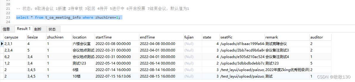 import com.zking.util.StringUtils;public class MeetingInfoDao extends BaseDao{// 会议信息新增public int add(MeetingInfo t) throws Exception {String sql="insert into t_oa_meeting_info(title,content,canyuze,liexize,zhuchiren,location,startTime,endTime,remark) values(?,?,?,?,?,?,?,?,?)";return super.executeUpdate(sql, t, new String[] {"title","content","canyuze","liexize","zhuchiren","location","startTime","endTime","remark"});}// 我的会议,后续其他的菜单也会使用private String getSQL() {return "select a.id,a.title,a.content,a.canyuze,a.liexize,a.zhuchiren\r\n" + ",b.`name` zhuchirennmae,\r\n" + "a.location,\r\n" + "DATE_FORMAT(a.startTime,'%Y-%m-%d %H-%m-%s') startTime,\r\n" + "DATE_FORMAT(a.endTime,'%Y-%m-%d %H-%m-%s') endTime,\r\n" + "a.state,\r\n" + "(\r\n" + " case a.state\r\n" + " when 0 then '取消会议'\r\n" + " when 1 then '新建'\r\n" + " when 2 then '待审核'\r\n" + " when 3 then '驳回'\r\n" + " when 4 then '待开'\r\n" + " when 5 then '进行中'\r\n" + " when 6 then '开始投票'\r\n" + " when 7 then '结束会议'\r\n" + " else '其他' end\r\n" + ") meetingstate,\r\n" + "a.seatPic,a.remark,a.auditor,\r\n" + "c.`name` auditorname from t_oa_meeting_info a \r\n" + "inner join t_oa_user b on a.zhuchiren=b.id\r\n" + "left join t_oa_user c on a.auditor=c.id and 1=1";}// 我的会议public List